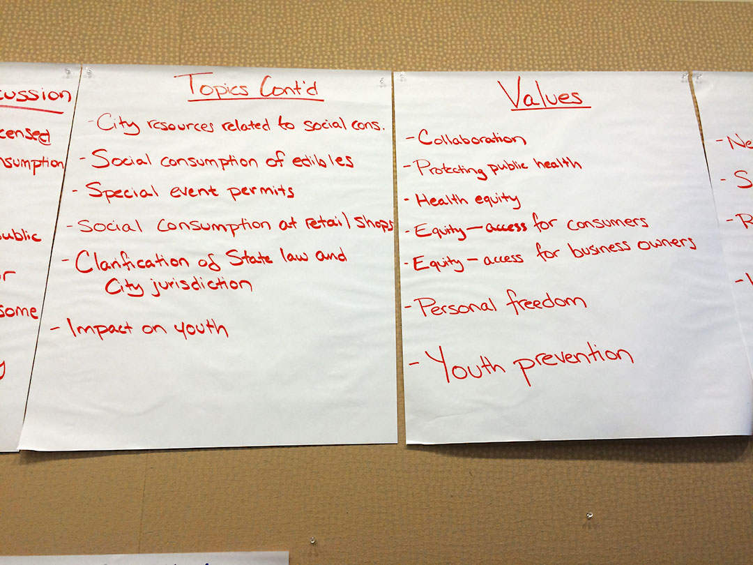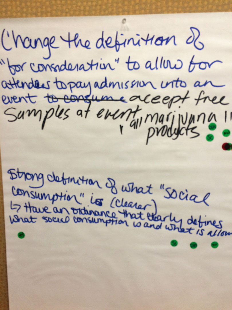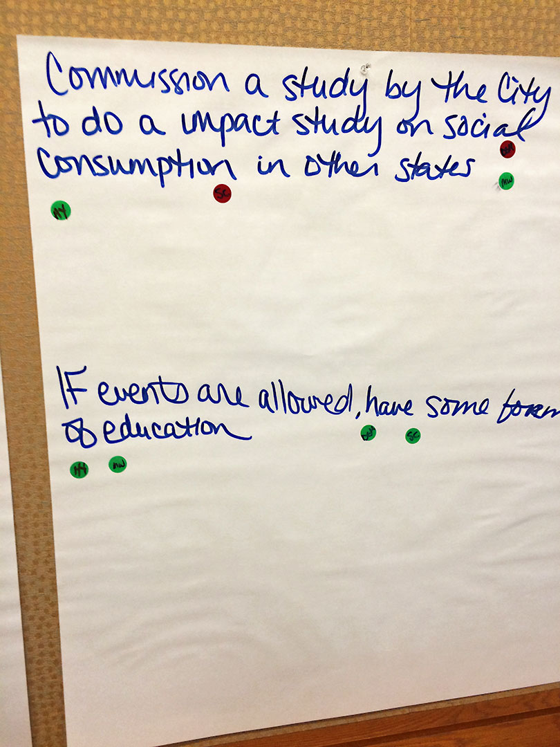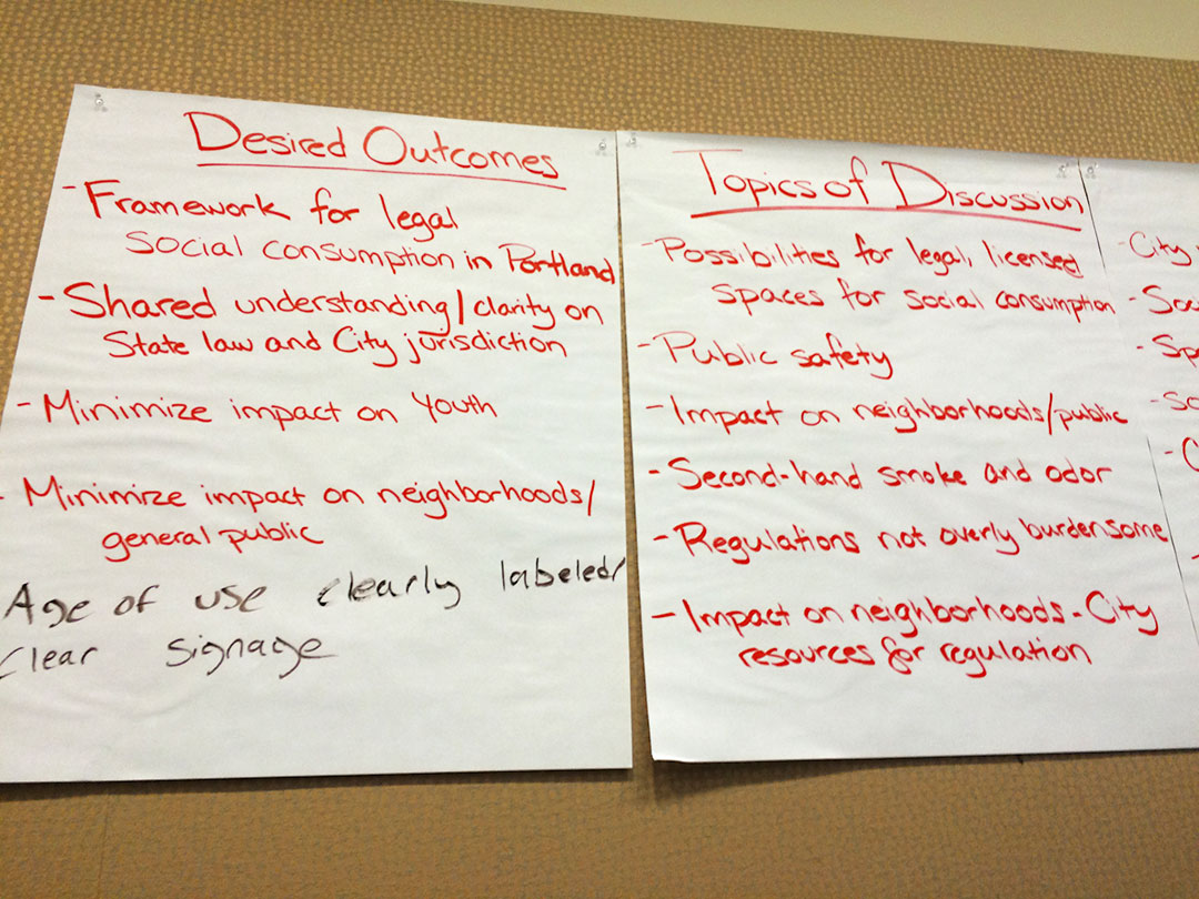 There was lots to talk about at last night’s public meeting, held by Portland’s Marijuana Oversight Team and panel guests who had gathered to discuss indoor social consumption rules, event sampling vs. event consumption and much more. There were many voices to be heard, ranging from dispensary owners and hoteliers to consumer and child safety advocates, and there were many others present who briefly spoke. The goal was to provide state legislature with a set of recommendations for moving forward on the aforementioned issues. The meeting had a well-informed moderator, and used discussion parameters such as “Desired Outcomes,” “Topics of Discussion,” and “Values” to achieve the recommendations.
